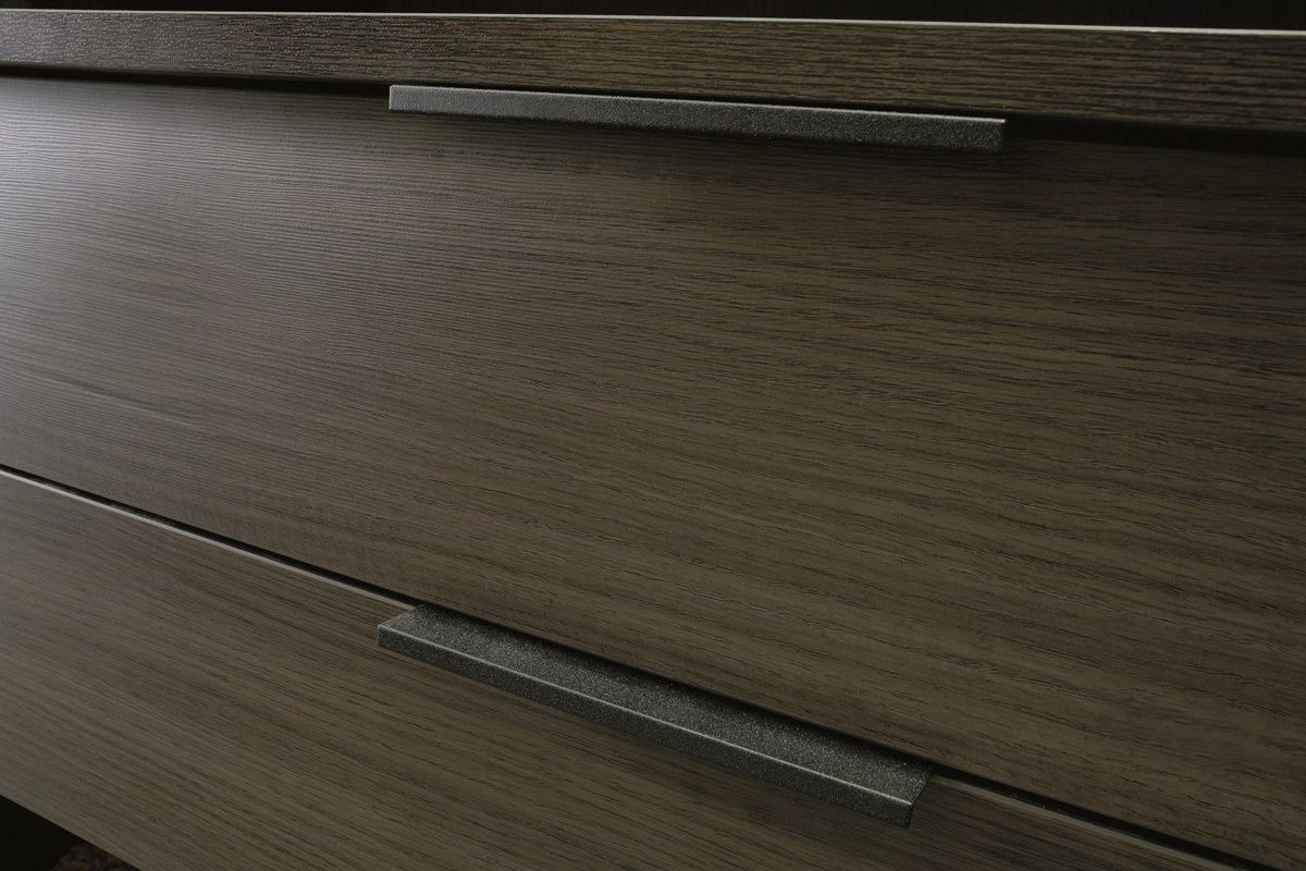 En amplios paños de roble americano con veta horizontal, libre de herrajes y variedad de lustre.